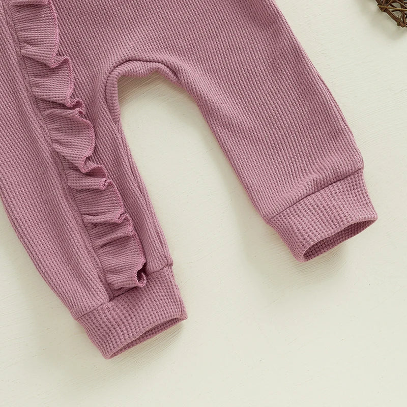 Description- This Baby Boho Romper made from waffle fabric , super soft , 3 rows of ruffle on the back, front ruffle covering zip.